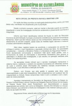 A prefeita de Clevelândia, Rafaela Losi, divulgou uma nota no final da manhã desta terça-feira (08), a respeito da Operação Caça-Fantasmas, deflagrada pela Polícia Civil, que investiga um esquema de contratação de funcionários fantasmas pela prefeitura municipal.