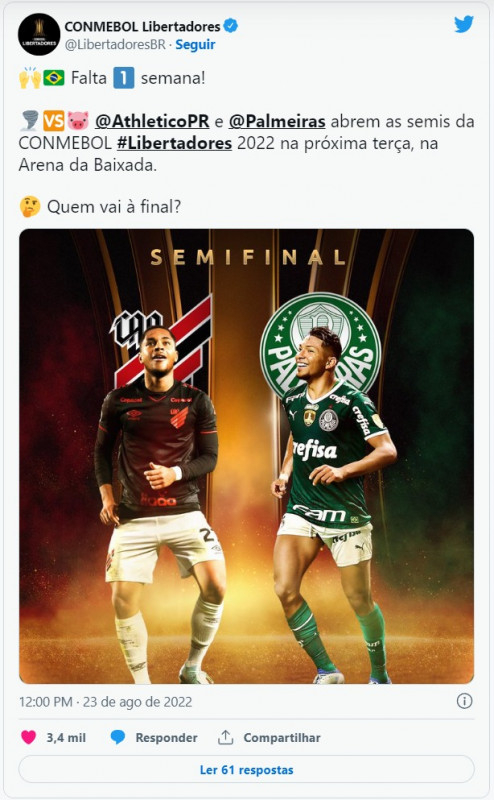 Athletico-PR e Palmeiras começam a decidir quem segue para a final da Copa Libertadores, a partir das 21h30 (horário de Brasília) desta terça-feira (30), na Arena da Baixada, em Curitiba. A Rádio Nacional transmite o jogão de bola ao vivo.