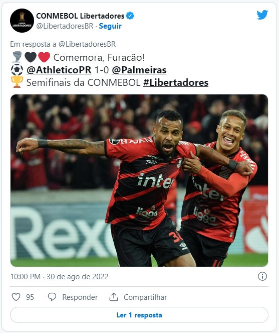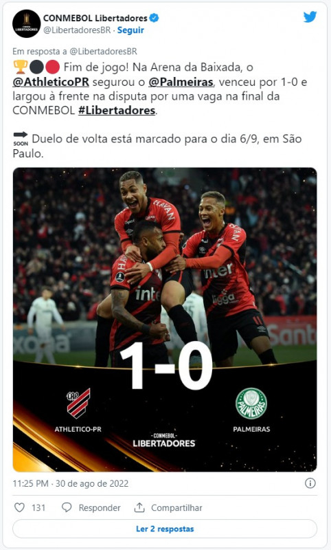 O Rubro-Negro paranaense, que busca retornar à final do maior torneio do continente após 17 anos, tem a vantagem do empate na partida de volta, na próxima terça-feira (6), às 21h30 (horário de Brasília), no Allianz Parque, em São Paulo. O clube alviverde precisa ganhar por dois ou mais gols de diferença para se classificar à terceira decisão seguida de Libertadores ainda no tempo normal. Se vencer por um gol, a decisão será nos pênaltis.