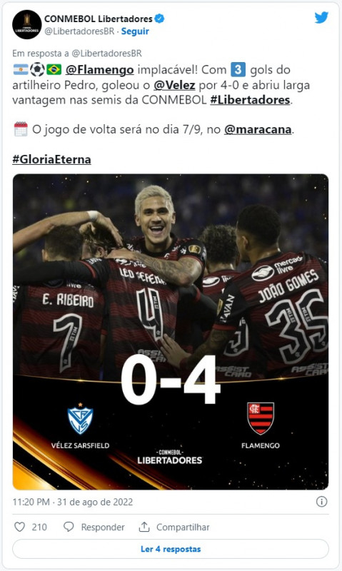 O Flamengo abriu ótima vantagem sobre o Vélez Sarsfield pelas semifinais da Libertadores. Nesta quarta-feira (31), o Rubro-Negro venceu o primeiro jogo do confronto por 4 a 0, no estádio José Amalfitani, em Buenos Aires (Argentina). O centroavante Pedro balançou as redes três vezes e disparou na artilharia da competição, com 11 gols.
