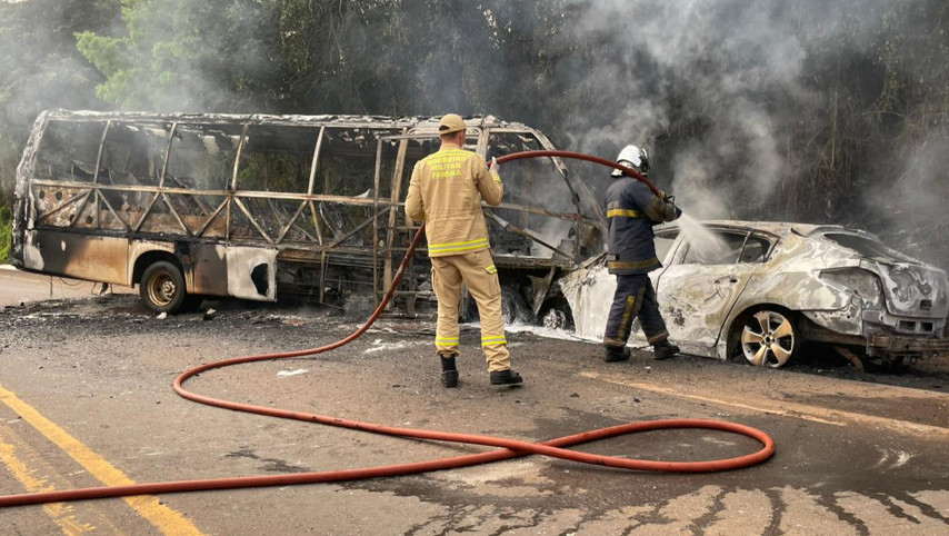 Micro ônibus escolar e carro pegam fogo após colisão na BR-280 em Marmeleiro